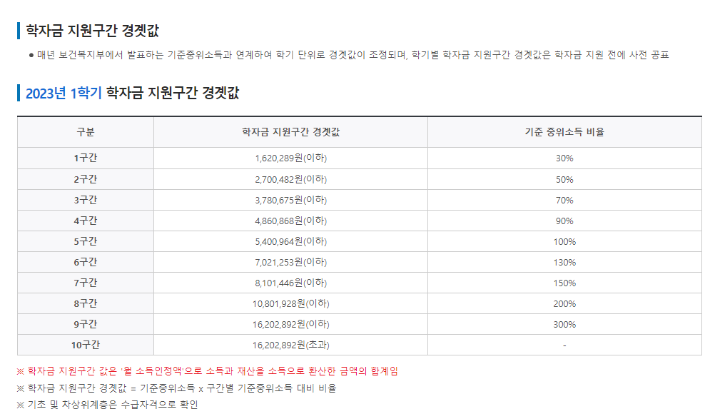 보건복지부에서 발표하는 기준 중위소득과 연계하여 학기단위로 경곗값을 조정하여 공표합니다.